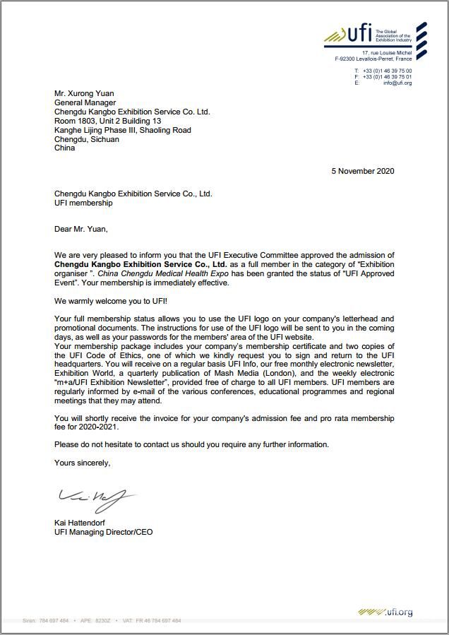 2020年11月,UFI(全球展覽業協會)發函祝賀:成都市康博會展服務有限公司旗下的中國·成都醫療健康博覽會(簡稱:成都醫博會)正式通過UFI認證。這標志著成都醫博會正式進入國際性品牌展會行列,并在展覽內容、展會組織、國際化、專業化等方面得到了國際專業機構的認可和肯定。