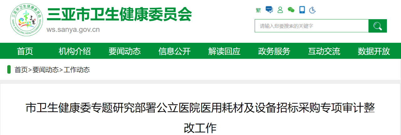 近日,海南省三亞市衛健委召開專題會議,研究部署公立醫院醫用耗材及設備招標采購專項審計整改工作。
