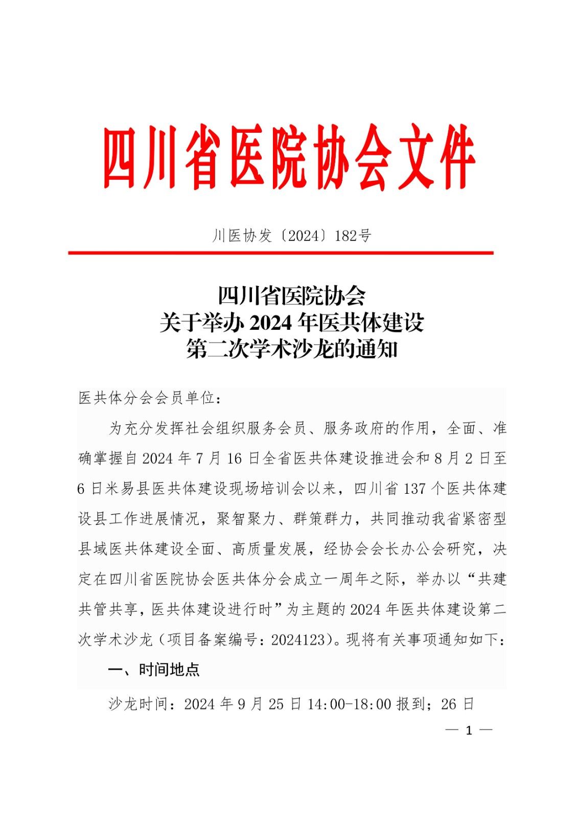 為充分發揮社會組織服務會員、服務政府的作用,全面、準確掌握自 2024 年 7 月 16 日全省醫共體建設推進會和 8 月 2 日至6 日米易縣醫共體建設現場培訓會以來,四川省 137 個醫共體建設縣工作進展情況,聚智聚力、群策群力,共同推動我省緊密型縣域醫共體建設全面、高質量發展,經協會會長辦公會研究,決定在四川省醫院協會醫共體分會成立一周年之際,舉辦以“共建共管共享,醫共體建設進行時”為主題的 2024 年醫共體建設第二次學術沙龍。如下為會議相關信息。