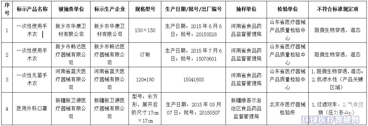 (一)手術衣3家企業3批次產品。新鄉市華康衛材有限公司、新鄉市暢達醫療器械有限公司生產的各1批次一次性使用手術衣,〔阻微生物穿透,濕態〕不符合標準規定;河南省藍天醫療器械有限公司生產的1批次一次性無菌手術衣,〔阻微生物穿透,濕態〕、抗滲水性(產品關鍵區域)不符合標準規定。
