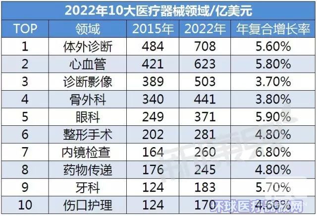 著名咨詢公司Evaluate旗下的EvaluateMedTech近日發布了一項對2016年醫療器械行業的總結以及對2022年的展望,報告稱2015-2022年醫療器械市場的年復合增長率預計約為5.2%,2022年全球醫療器械市場總容量將達到5298億美元。