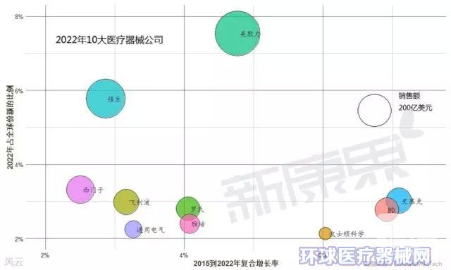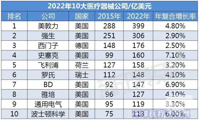 而在公司方面,美敦力仍將保持全球醫療器械銷售額的頭名,而且優勢越來越大,其未來幾年的復合增長率接近5%,到2022年銷售額將達到399億美元,強生緊隨其后,銷售額也將超過300億美元,強生不愧為全球最大的醫藥公司,在EvaluatePharma發布的全球處方藥銷售額中強生以398億美元位列第5位。而另外一家在制藥和醫療器械方面都堪稱巨頭的公司是羅氏,其醫療器械2022年銷售額預測將約為148億美元,制藥方面優勢則更為明顯,羅氏最近幾年藥物銷售額增長較快,到2022年或將成為全球處方藥銷售首位。