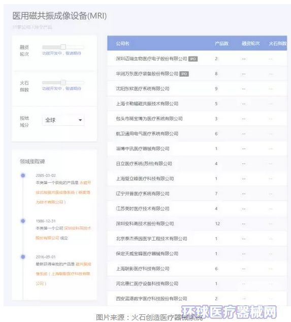 根據火石創造的醫療器械系統提供的數據,在醫療磁共振成像設備(MRI)這一大類中,從2015年3月新奧博為技術有限公司的永磁開放式核磁共振成像系統成為本類第一個獲批上市的磁共振設備以來,到如今我國已有31家公司涉及相關業務,目前已經138個產品獲得了批準。